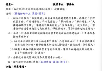 永續影響力: 為配合政府推動「政府機關及學校用電節約能源提升計畫」(113~115年),本校以112年為基期年,設定至115年提升整體用電效率3%為目標。校方定期召開節能會議,擬定年度節能目標與執行措施,並每年檢討改進,以落實能源管理與碳減排流程。此舉符合 SDG7.2.3 碳減排管理流程 之指標精神,展現學校透過制度化能源管理與效率提升,持續推動減碳與永續校園建設之具體行動。