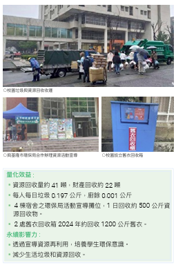 永續影響力: 該行動建立了明確的碳管理和減少二氧化碳排放的規劃流程。透過設立基準年並啟動全校性溫室氣體盤查作業,學校展現了前瞻規劃能力,將氣候行動具體落實到管理與工程層面,以科學化的方式制定減碳策略,符合SDG 7.2.3對於制定碳減排管理流程的要求.