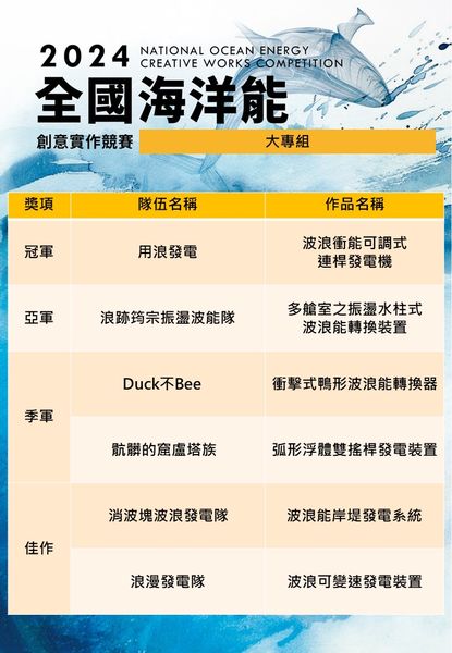 海洋能源競賽的開始:自民國100年起,海洋大學開始舉辦海洋能源相關競賽。這競賽涵蓋了波能和流能轉換器的設計、效率計算、成本和安裝等領域。這個競賽已經持續多年,並取得了豐碩的成果。