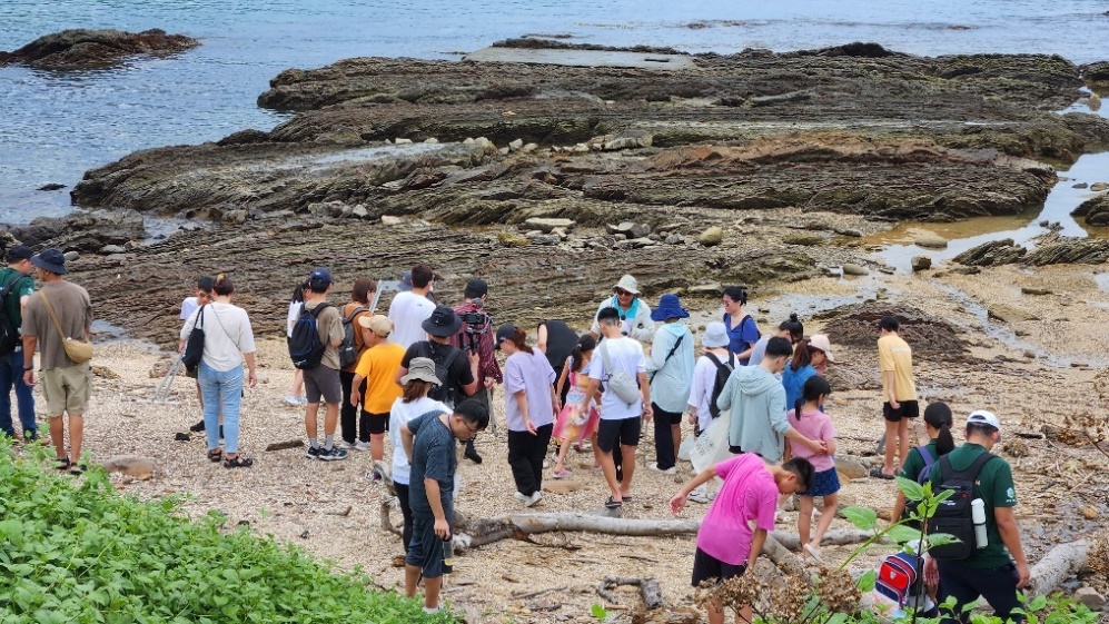 This activity includes an observation of intertidal organisms in the Ma-gang intertidal zone, a cultural and ecological tour of the Mao-ao community, beach and stream cleaning, and a traditional haenyeo underwater collection and snorkeling experience. Fifty people from Cathay Life Insurance participated, with instructors Dr. Xiao Yaoren and Dr. Shikina Shinya providing explanations.