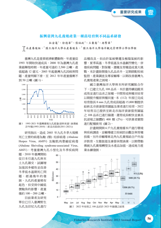 國立臺灣海洋大學與水產試驗所的研究團隊合作選育出九孔108 品系,為持續提升 九孔108 品系的種原和種貝數量,本計畫持續進行保種、中間育成與種貝培育,並進行業 者輔導及推廣,持追蹤其成效。本年度成功培育殼長10 毫米以上之九孔108 品系種苗至 少30,000 顆,並轉移至新北市資源復育園區進一步中間育成及選育。本計畫建立追蹤7 戶九孔養殖樣本戶,包括位於苗栗通霄及宜蘭頭城的4 戶種苗場和位於新北市的3 戶養 成場。其中宜蘭的一戶種苗場已取得九孔108 品系,並成功培育純品系及雜交品系種苗。 其餘樣本戶我們則依其需求分別提供疾病防治、育種技術及行銷推廣的輔導。此外,計畫 期間我們還完成了一份以九孔為主題的食農教育企畫書,旨在促進傳統九孔養殖的轉型 與經營,推動水產品加值,達成地方產業的永續發展。