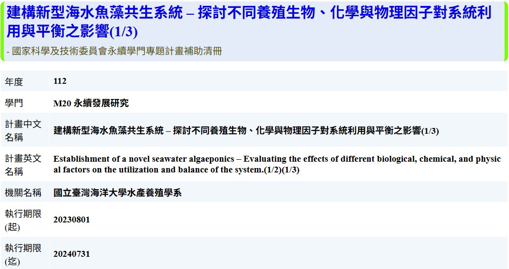永續影響力:本研究以海水魚藻共生系統為核心,探討瓜子鱲與兩種大型藻類(小葉蕨藻、蘇氏海木耳)在不同放養密度下的生長表現與水質變化。結果顯示,適當密度可提升藻體吸收氨氮與磷酸鹽效率,穩定水質並維持魚類健康,證實魚藻共生具備生態與經濟雙重效益。研究亦從產業面分析臺灣魚菜共生之社會趨勢,指出產業學術發展、季節挑戰與法規限制等問題,呼籲結合技術創新與政策支持以強化產業韌性。整體而言,此研究從生物學、環境科學與社會經濟多面向出發,展現海洋大學推動海洋永續資源利用與藍色生產技術創新之具體成果,符合 SDG 14.3.1「發展科學研究以支持海洋生態系與資源永續利用」之目標。