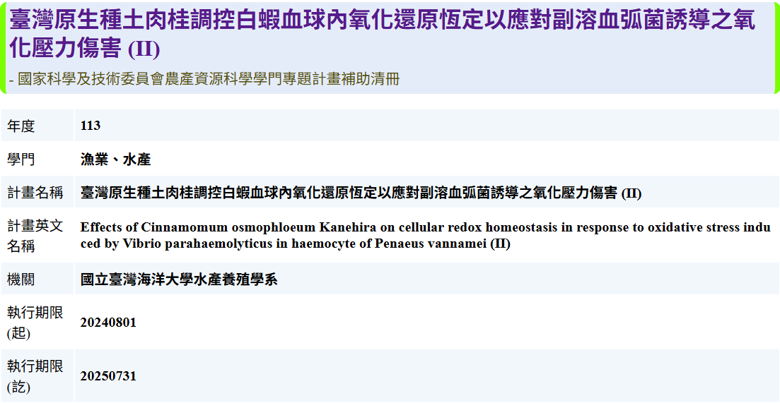 臺灣原生種土肉桂調控白蝦血球內氧化還原恆定以應對副溶血弧菌誘導之氧化壓力傷害 (II)