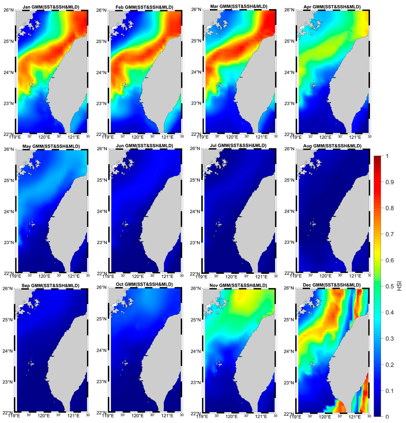 Sustainable Impact:This study applied a Habitat Suitability Index (HSI) model to analyze the spatial and temporal distribution of wild grey mullet in the Taiwan Strait, identifying key environmental predictors such as sea surface height, temperature, and chlorophyll concentration. The model's findings offer critical scientific insight into species habitat preferences and migration patterns, directly supporting sustainable fisheries management and conservation planning. By providing a robust data-driven foundation for policymakers, industry, and academia, the research advances SDG 14.5.5, which emphasizes using scientific knowledge to enhance marine conservation and ensure the sustainable use of ocean resources.