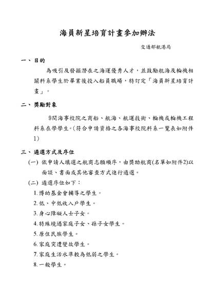 交通部航港局為強化海事產業人才培養,於111年起結合社會團體、航商、海事校院及政府部門共同合作推出「海員新星培育計畫」,補助有志青年學子,替航商招募更多優質的海員新星,進行彼此之資源分享及整合與經驗交流,特意定本合作備忘錄,以作為具體合作之依據。