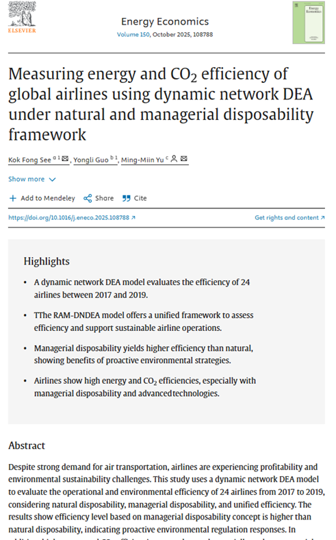 國立臺灣海洋大學運輸科學系游明敏教授與印度學者 Ipsita Rakshit,於2024年共同發表,How to Establish Input and Output Targets for Airlines with Heterogeneous Production Technologies: A Nash Bargaining DEA Approach within the Meta-frontier Framework. Journal of Air Transport Management, 116, 102576. (19 March 2024) (SSCI).